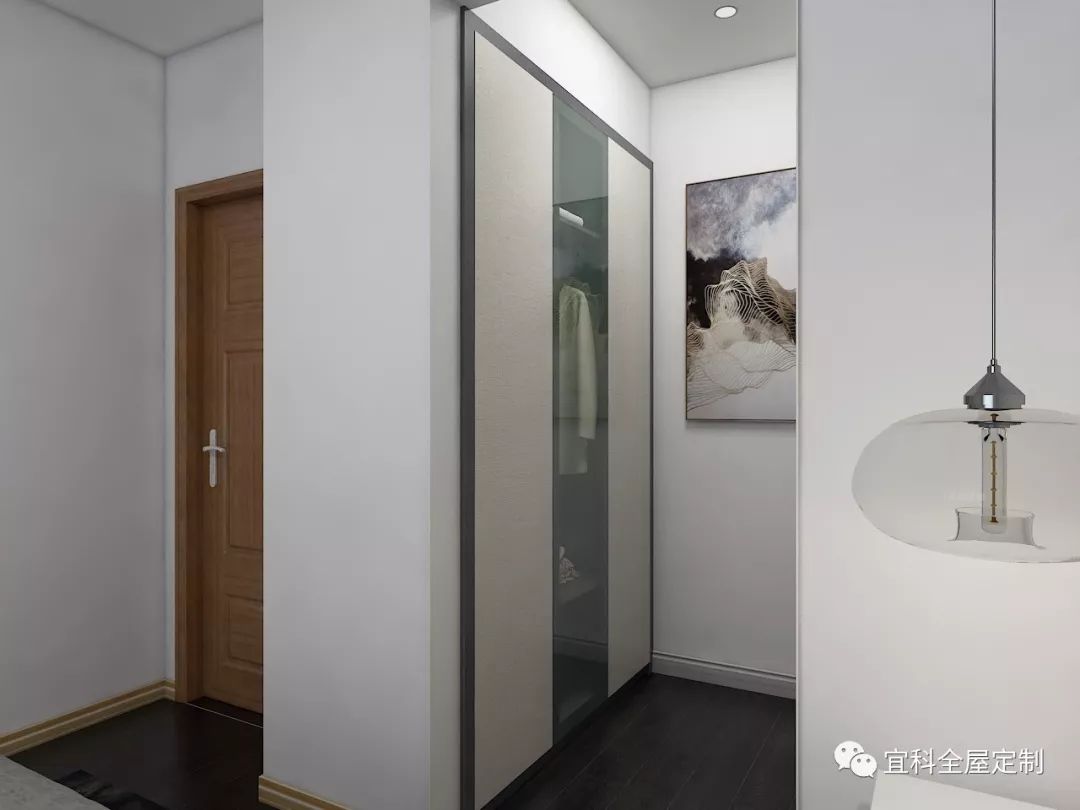左右對稱的印尼布紋柜門設(shè)計,營造出了很好的視覺效果。而中間通透的玻璃門設(shè)計,則弱化了逼仄空間帶來的壓抑感。三扇柜門,開門方式均為彈開式設(shè)計,快速利落的完成開柜、換衣系列動作。一側(cè)墻面上的藝術(shù)掛畫,在匆忙換衣間隙,余光斜瞄幾眼,頓時讓一天的心情愉悅不少!