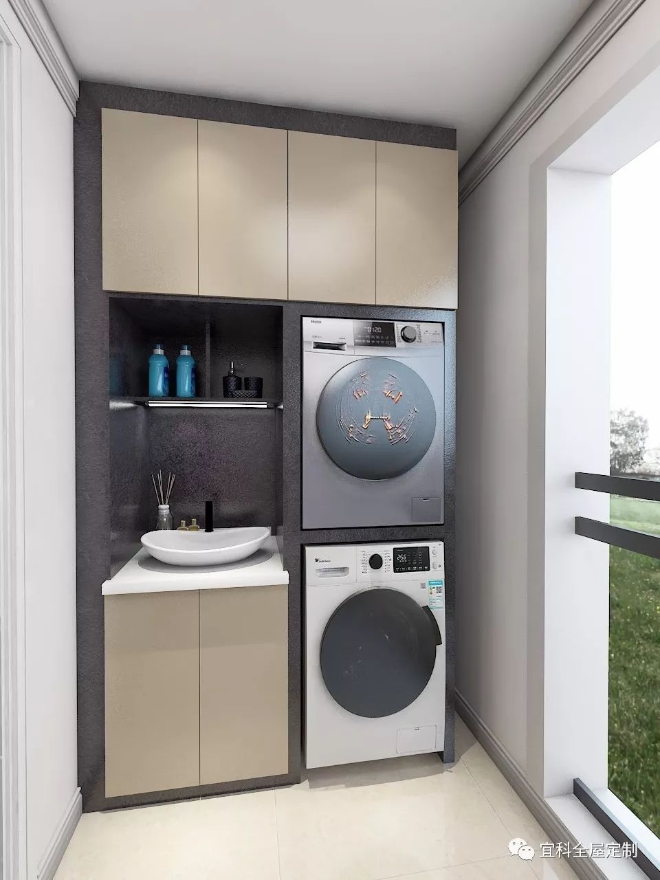 濃郁的生活氣息,在方寸之地的陽臺一覽無余。陽臺柜,由沉穩(wěn)的灰石紋和淡雅的杏仁黃兩種元素構(gòu)成,兼具美觀與實用于一體。一通到頂?shù)脑O(shè)計整體增加了柜子的容納量,柜體區(qū)間規(guī)劃明確,洗衣區(qū)、烘干區(qū)、洗漱區(qū),收納區(qū)依次排開,絲毫沒有因為空間的局促而亂了陣腳,充分體現(xiàn)了設(shè)計者的貼心,和對生活理解的透徹!