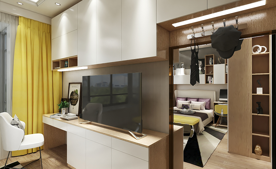 利用柜門與展示架結(jié)合避免視覺凌亂感讓空間錯(cuò)落有致,