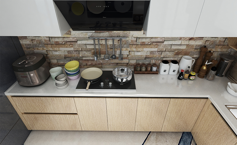 除了做料理臺與用餐區(qū),還能嵌入各種電器設備,旁邊的儲物柜可幫助收納;