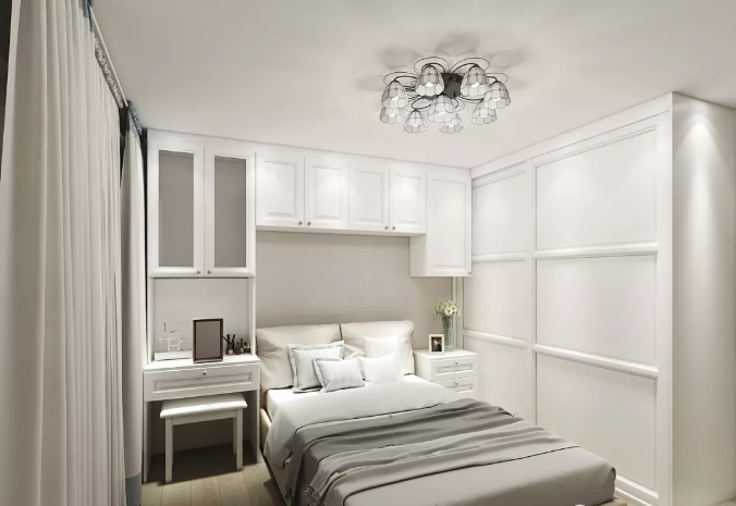 根據(jù)空間的尺寸定制整體衣柜,可以大大提高臥室的使用率,還可以加入梳妝臺、書桌等功能。
